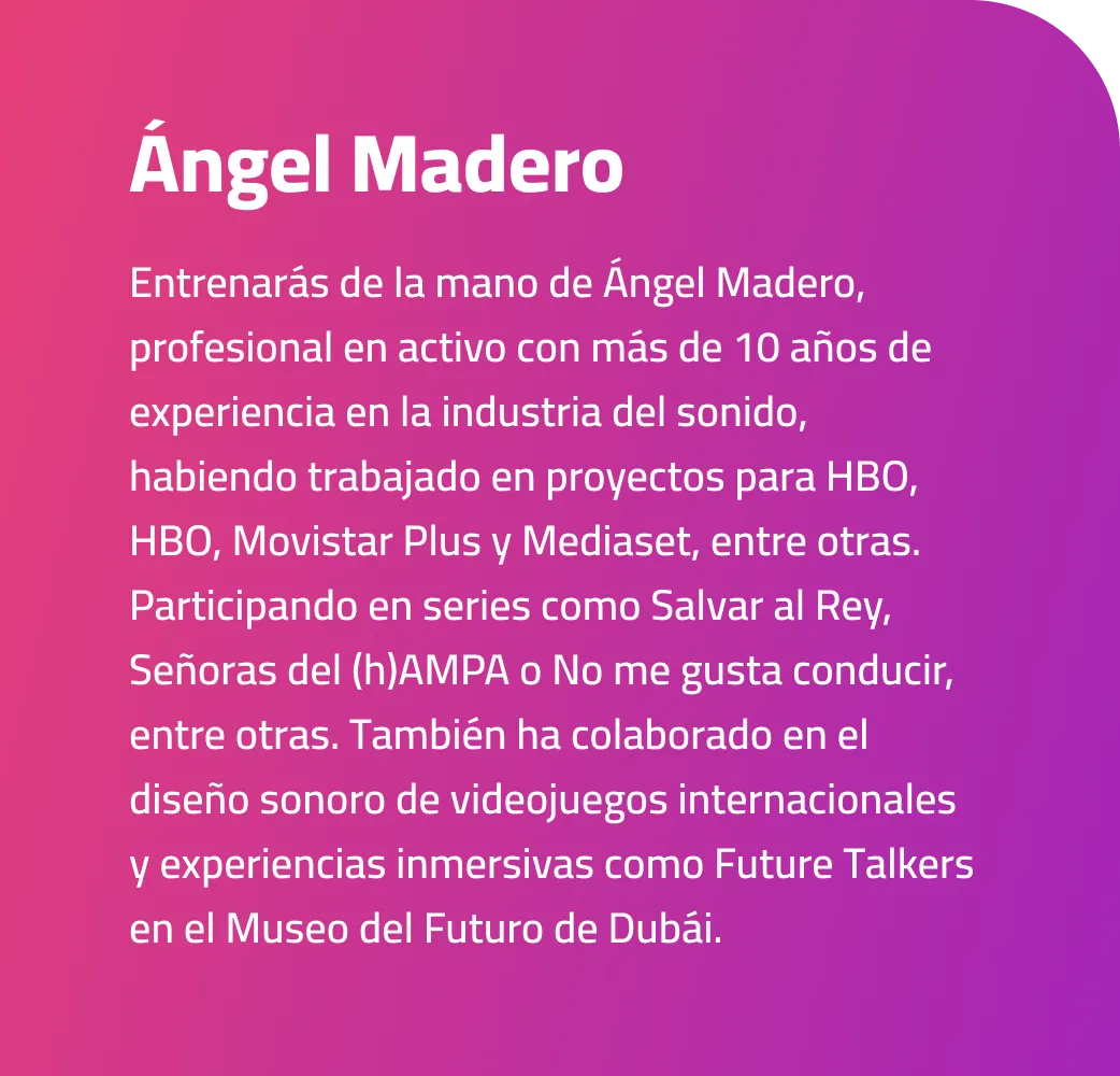 Entrenarás de la mano de Ángel Madero, profesional en activo con más de 10 años de experiencia en la industria del sonido, habiendo trabajado en proyectos para HBO, Movistar Plus y Mediaset, entre otras. Participando en series como Salvar al Rey, Señoras del (h)AMPA o No me gusta conducir, entre otras. También ha colaborado en el diseño sonoro de videojuegos internacionales y experiencias inmersivas como Future Talkers en el Museo del Futuro de Dubái.